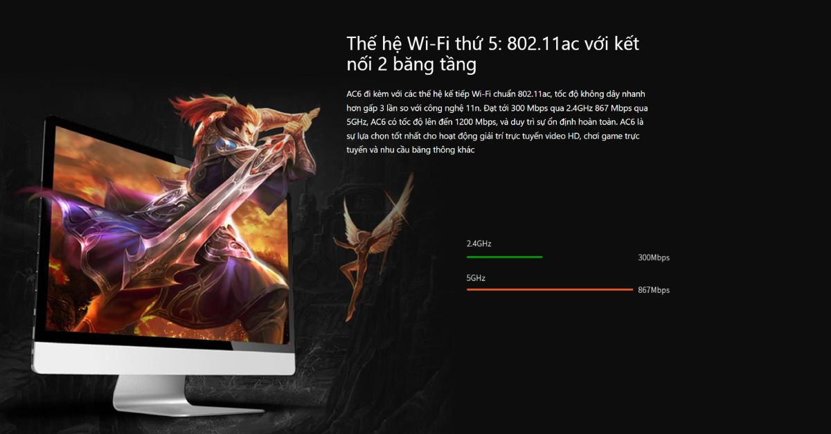 AC6 đi kèm với các thế hệ kế tiếp Wi-Fi chuẩn 802.11ac, tốc độ không dây nhanh hơn gấp 3 lần so với công nghệ 11n. Đạt tới 300 Mbps qua 2.4GHz 867 Mbps qua 5GHz, AC6 có tốc độ lên đến 1200 Mbps, và duy trì sự ổn định hoàn toàn. AC6 là sự lựa chọn tốt nhất cho hoạt động giải trí trực tuyến video HD, chơi game trực tuyến và nhu cầu băng thông khác