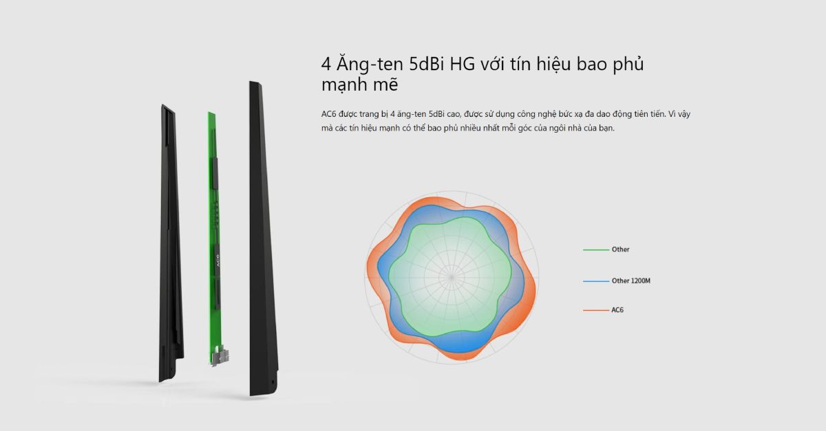 AC6 được trang bị 4 ăng-ten 5dBi cao, được sử dụng công nghệ bức xạ đa dao động tiên tiến. Vì vậy mà các tín hiệu mạnh có thể bao phủ nhiều nhất mỗi góc của ngôi nhà của bạn.