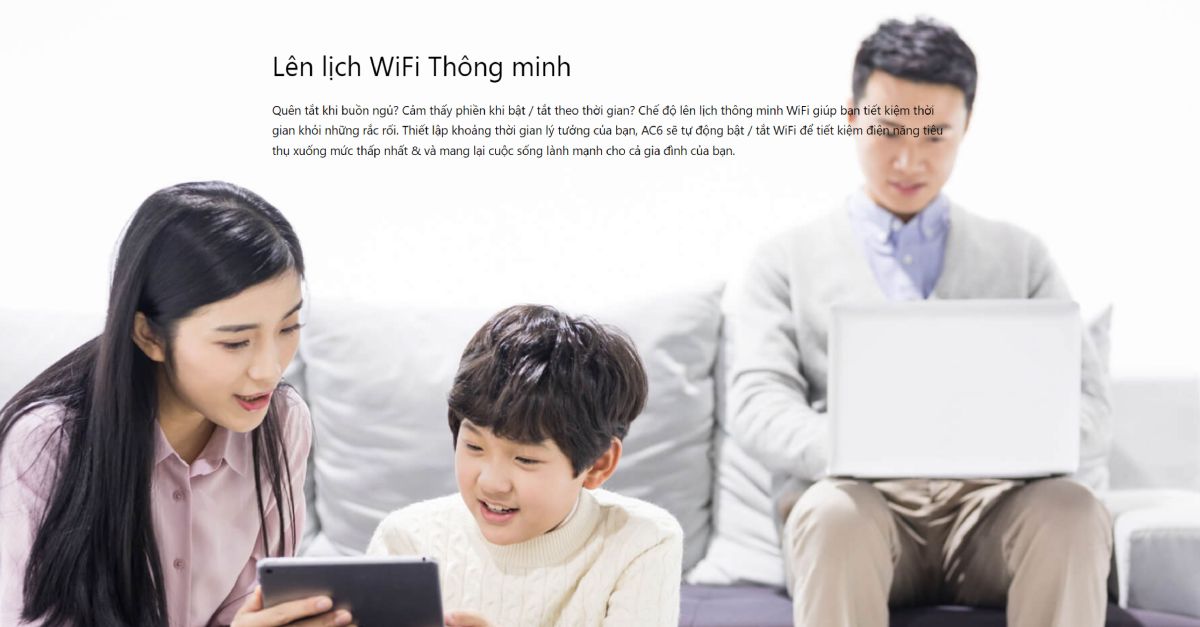 Quên tắt khi buồn ngủ? Cảm thấy phiền khi bật / tắt theo thời gian? Chế độ lên lịch thông minh WiFi giúp bạn tiết kiệm thời gian khỏi những rắc rối. Thiết lập khoảng thời gian lý tưởng của bạn, AC6 sẽ tự động bật / tắt WiFi để tiết kiệm điện năng tiêu thụ xuống mức thấp nhất & và mang lại cuộc sống lành mạnh cho cả gia đình của bạn.