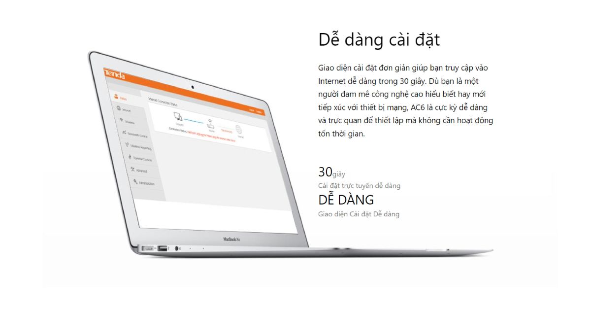 Giao diện cài đặt đơn giản giúp bạn truy cập vào Internet dễ dàng trong 30 giây. Dù bạn là một người đam mê công nghệ cao hiểu biết hay mới tiếp xúc với thiết bị mạng, AC6 là cực kỳ dễ dàng và trực quan để thiết lập mà không cần hoạt động tốn thời gian.