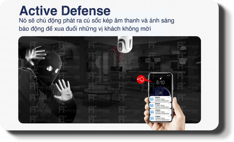 - Khi Camera DAHUA HERO C1 phát hiện có sự đột nhập của nhân viên, nó sẽ chủ động phát ra âm thanh cảnh báo decibel cao để ngăn chặn và xua đuổi kẻ xâm nhập, đồng thời xử lý nguy hiểm từ trong trứng nước