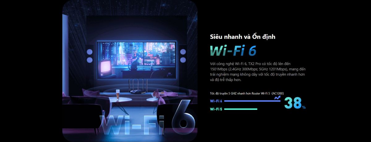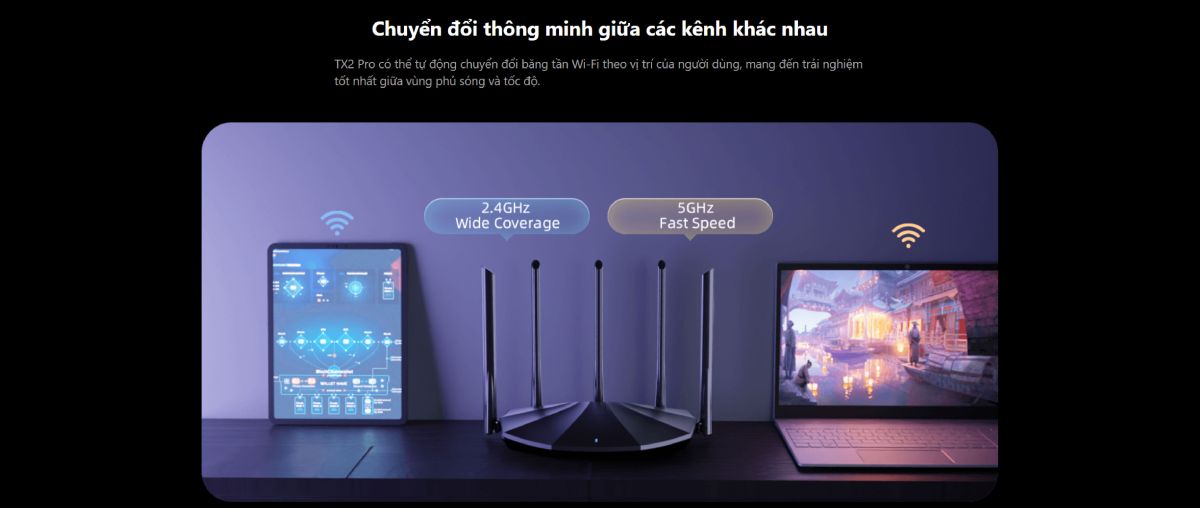 TX2 Pro có thể tự động chuyển đổi băng tần Wi-Fi theo vị trí của người dùng, mang đến trải nghiệm tốt nhất giữa vùng phủ sóng và tốc độ.