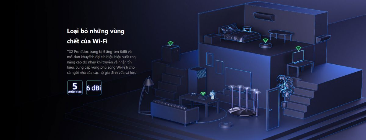 TX2 Pro được trang bị 5 ăng-ten 6dBi và mô-đun khuyếch đại tín hiệu hiệu suất cao, nâng cao độ nhạy khi truyền và nhận tín hiệu, cung cấp vùng phủ sóng Wi-Fi 6 cho cả ngôi nhà của các hộ gia đình vừa và lớn.