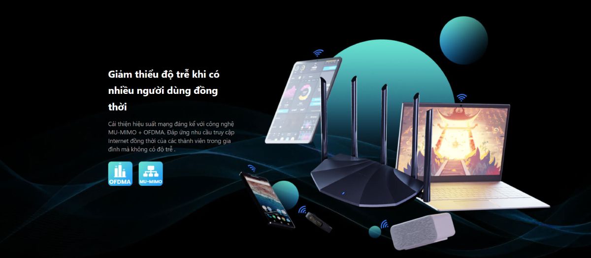 Cải thiện hiệu suất mạng đáng kể với công nghệ MU-MIMO + OFDMA. Đáp ứng nhu cầu truy cập Internet đồng thời của các thành viên trong gia đình mà không có độ trễ .