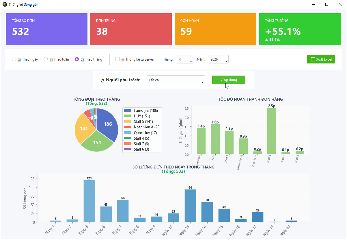 Chức năng thống kê trên Camsight giúp bạn quản lý sản lượng đơn hàng theo ngày, tuần, tháng.